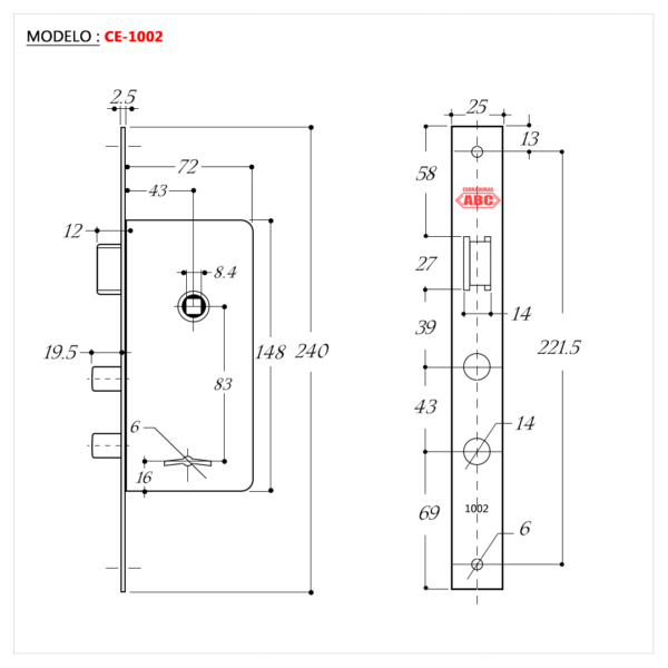 Home » CERRADURAS » ABC 1002 ABC 1002 ABC Frente: 25x240x2,5mm. Caja: 147×70. 6 Combinaciones de Acero. 2 Pernos giratorios (14mm). Frente Niquelado y Caja zincada. Nuez y pestillo de bronce. Incluye 2 Llaves de bronce, bocallaves y contrafrente. Consultá por este producto