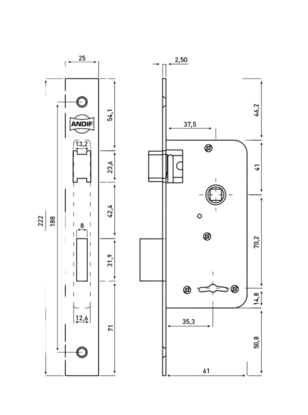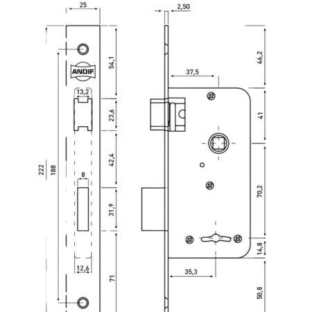 Pestillo, nuez y 2 llaves 100% bronce. Zincada en azul.
